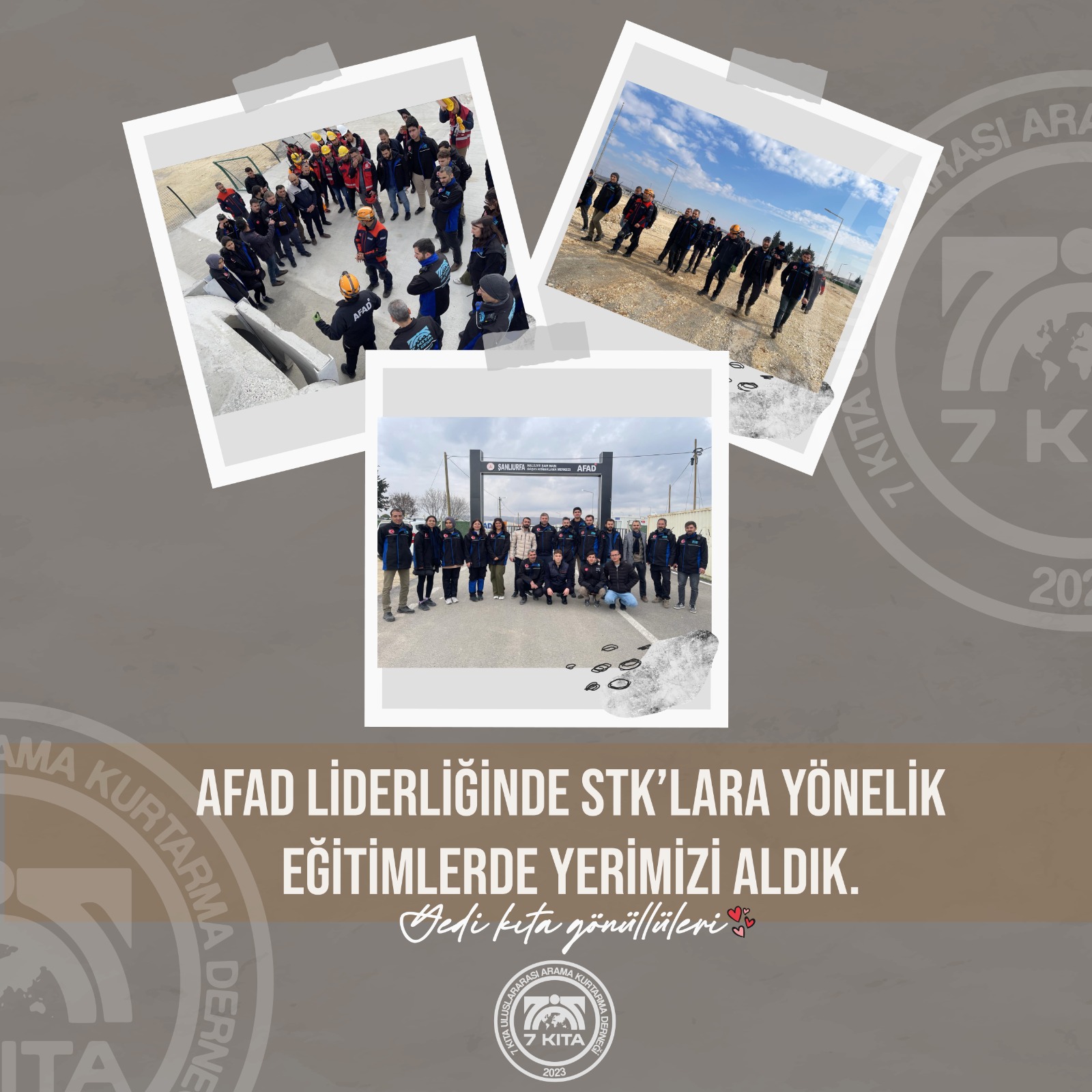 Yedi Kıta ARma Kurtama Dernği Üyelerine yönelik Şanlıurfa İl Sağlığ Müdürlügü Eğitim Birimi Tarafınadan İlk yardım eğitimi verilecektir. Eğitim sonda sınav ve başarılı olanlara sertifika verilecektir.