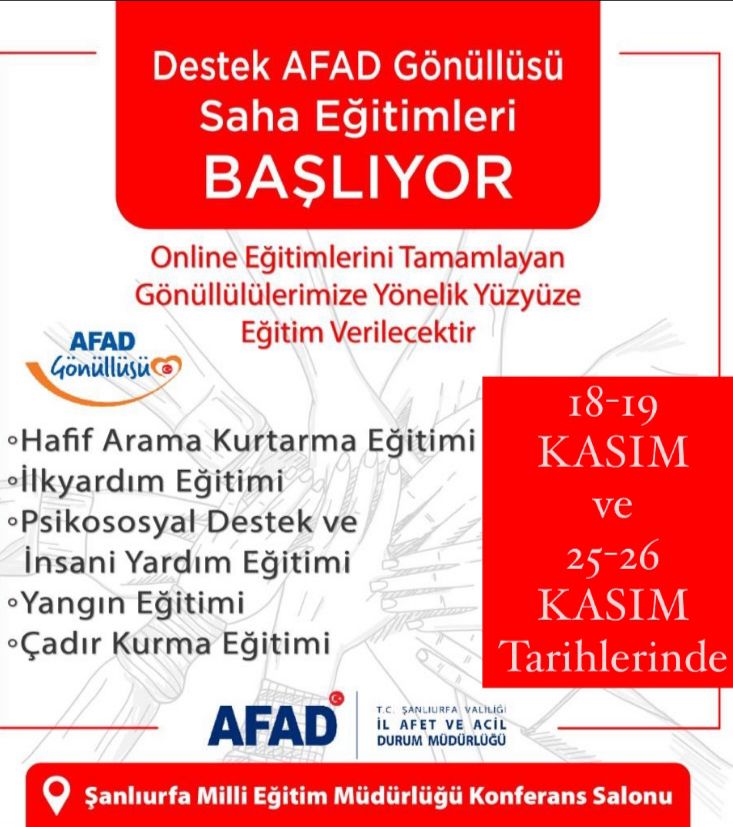 HATIRLATMA18 Kasım 2023 tarihinde saat 09.00-16.00 arası Milli Eğitim Konferans Salonunda olacaktır.19 Kasım 2023 tarihinde saat 09.00-16.00 arası Şanlıurfa Afad İl Müdürlüğü Arama Kurtarma binasında olacaktır.25-26 Kasım 2023 saat 09.00-16.00 arası Milli Eğitim Konferans ...